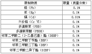 206年6月4日,欧盟国家中国官方网站公报(OJ)敲定RoHS2.0更正指令码(EU)2015/863,正式的将DEHP、DBP、BBP、DIBP添加绪论Ⅱ仅限商品通知单中,到此绪论Ⅱ就有九项强制电脑监控商品,具体情况见下表: