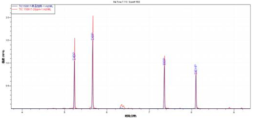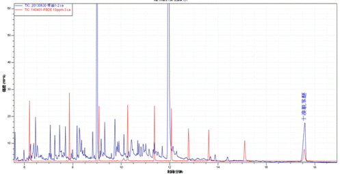 产品的样品TIC图(橙色)与多溴联苯醚混标TIC图(小白)